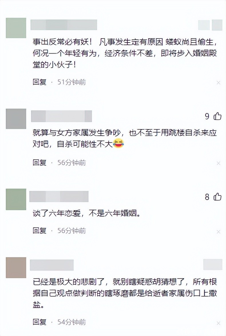 暗示婚礼前两人可能有过争吵,但邻居和亲友都表示没听说,甚至提出阳芳跳楼可能不是单纯殉情,而是“内心有愧”。